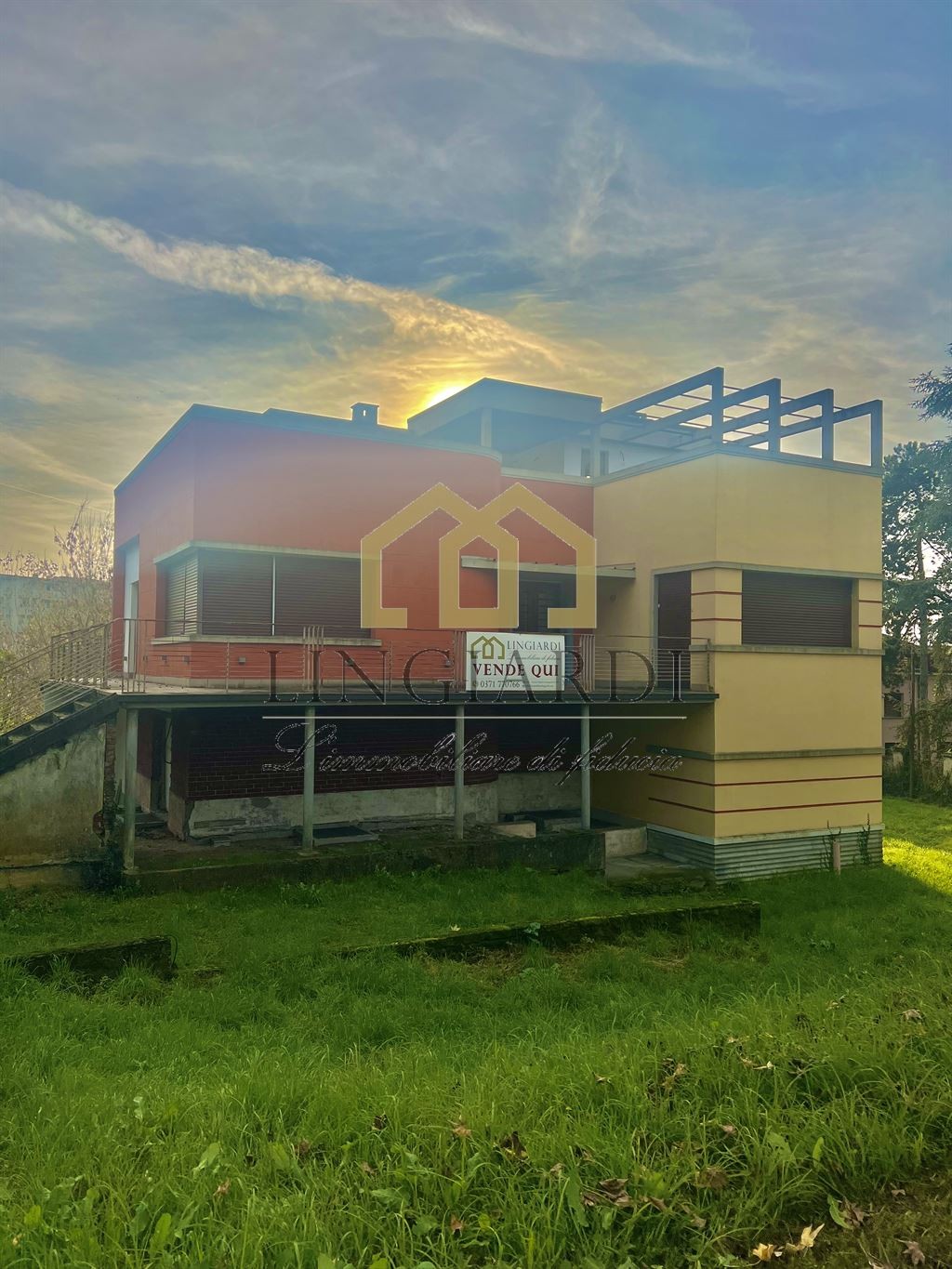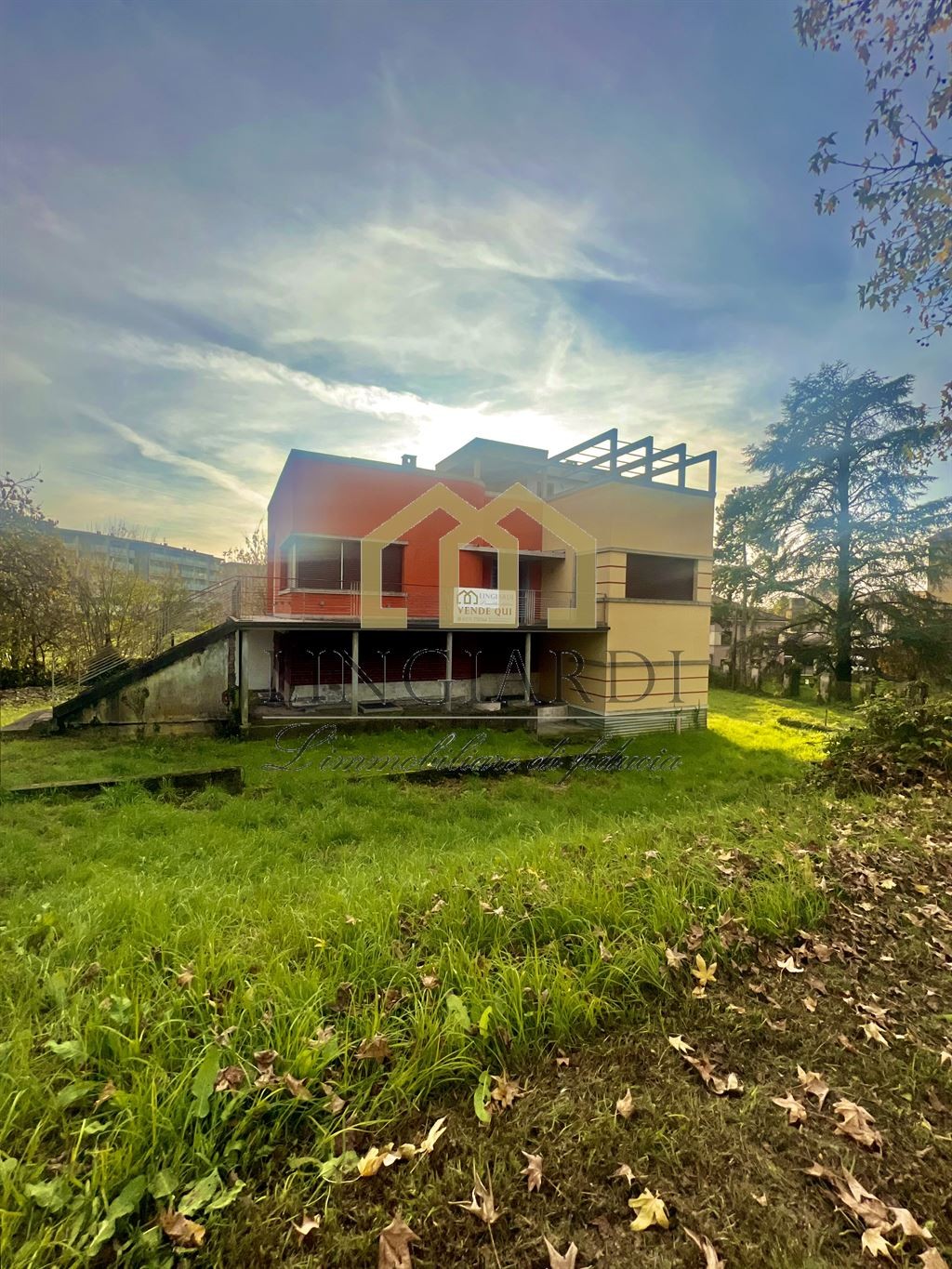 L’edificio si erge su un lotto triangolare, immerso in un ampio giardino che ne esalta la bellezza architettonica. La residenza principale si sviluppa su più livelli ed è accessibile sia tramite un’imponente scala esterna che da un comodo ascensore, offrendo una soluzione pratica per gli spostamenti tra i piani