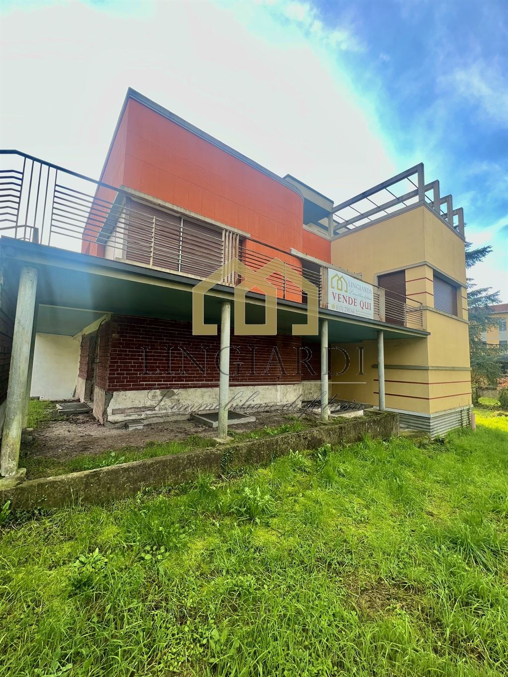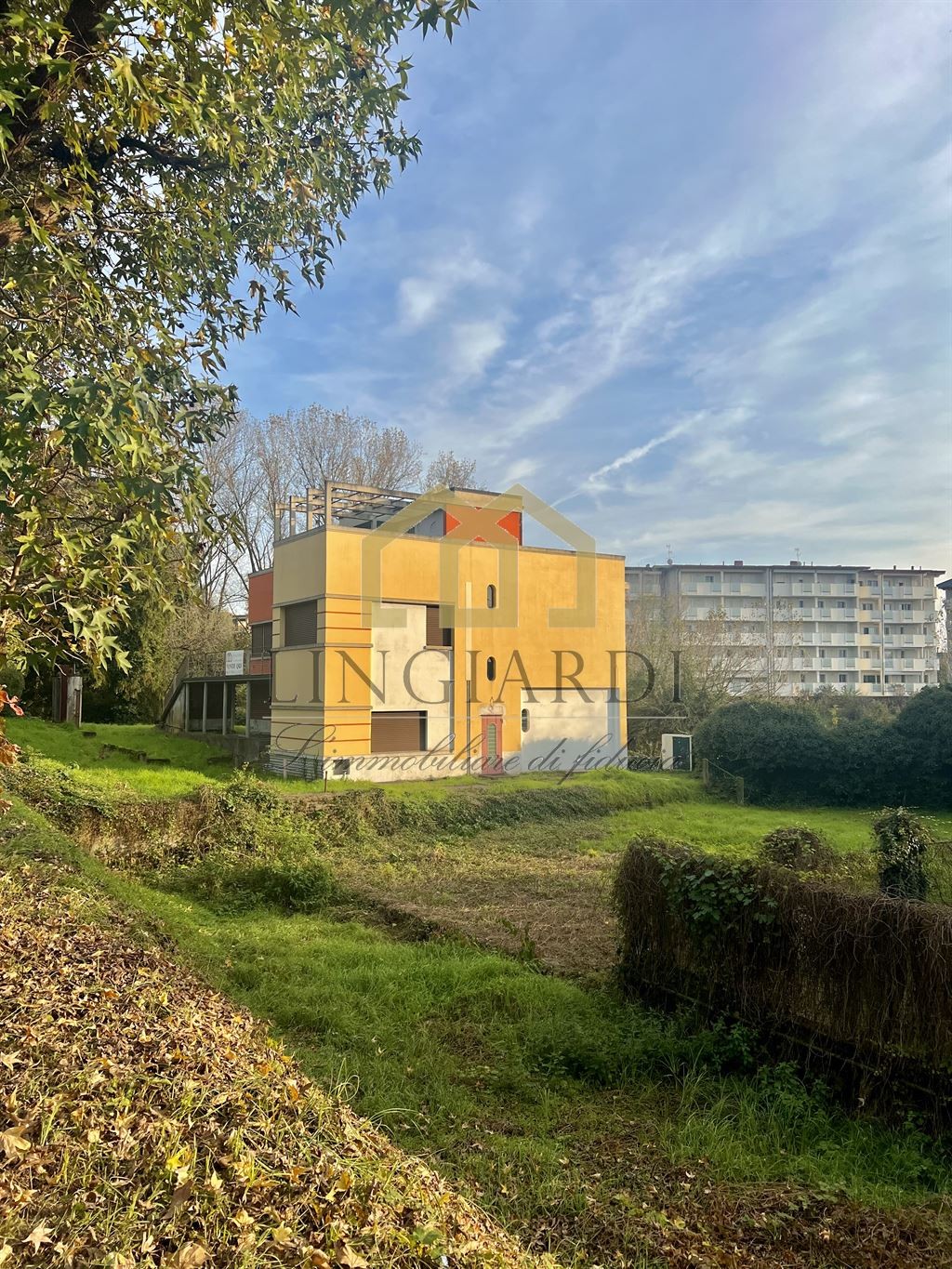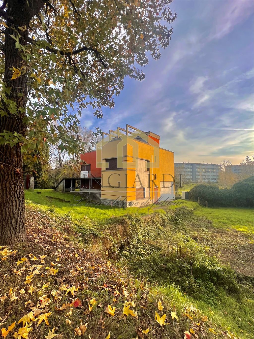 L’edificio si erge su un lotto triangolare, immerso in un ampio giardino che ne esalta la bellezza architettonica. La residenza principale si sviluppa su più livelli ed è accessibile sia tramite un’imponente scala esterna che da un comodo ascensore, offrendo una soluzione pratica per gli spostamenti tra i piani